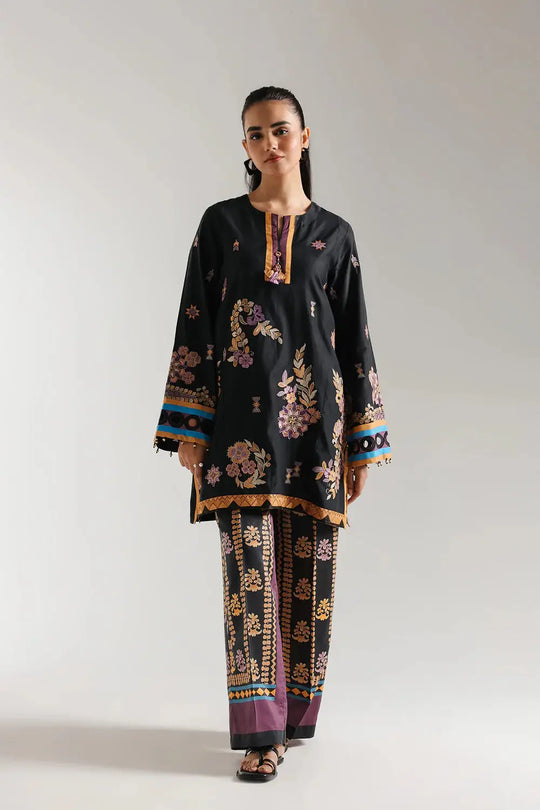 Introducing the ETHNIC EMBROIDERED SUIT | E2992, a stunning two-piece ensemble that beautifully blends traditional craftsmanship with contemporary style. Designed for the modern ethnic women who appreciate elegance and comfort, this outfit features a deep black shirt adorned with vibrant floral embroidery and a trendy printed culotte trouser, making it a perfect choice for summer occasions.