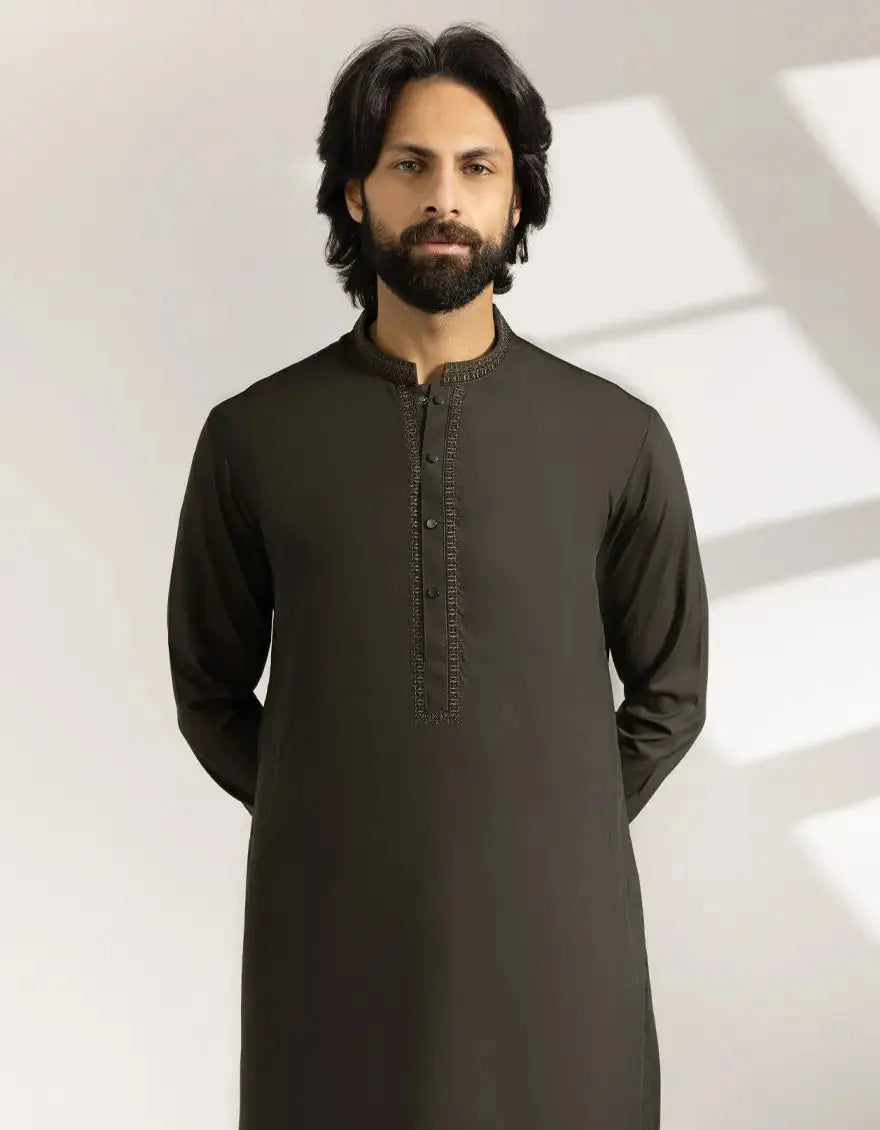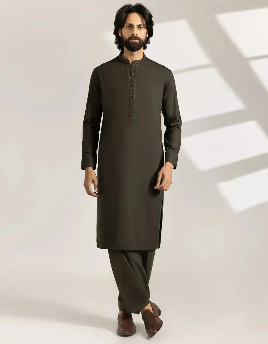 Featuring clean stitching and thoughtful detailing, this kameez shalwar set is designed to impress. The army green hue, crafted from a premium blended fabric, provides a rich, depth-filled color that stands out while maintaining a semi-formal appeal. The fabric ensures a comfortable fit, making it ideal for long wear without compromising on style.
