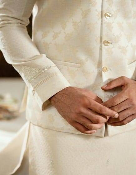 Off-white self-jacquard waistcoat featuring delicate embroidery on the collar and pocket. This waistcoat is the perfect addition to your traditional wardrobe. Its elegant style adds a touch of refinement to your outfit.