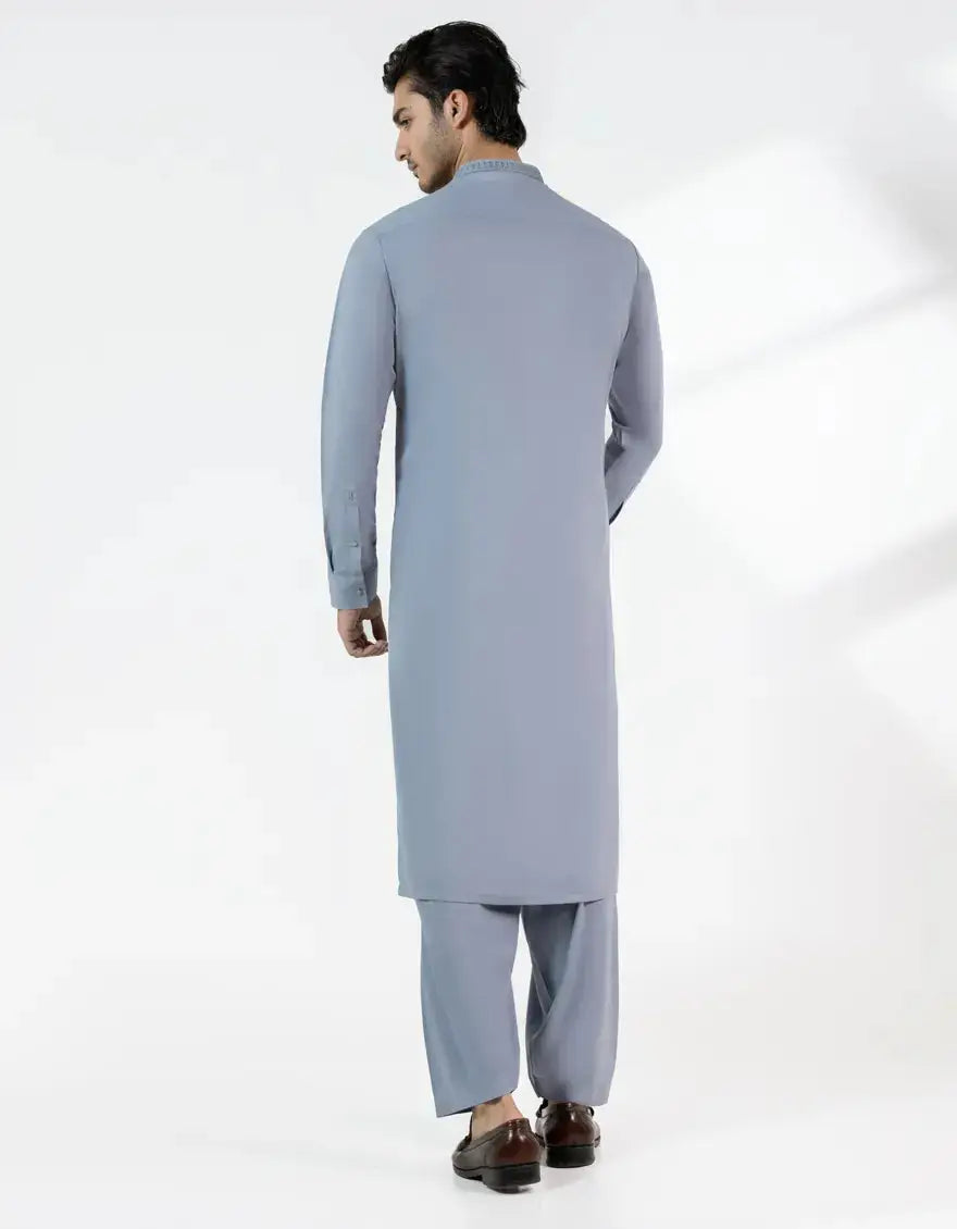 Back view of J. Light Grey Kameez Shalwar by Junaid Jamshed, showcasing its clean tailoring and comfortable fit for classic semi-formal wear.