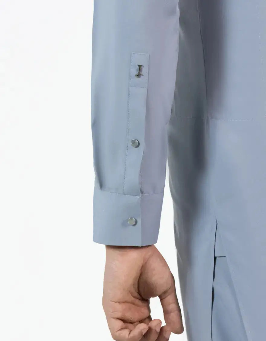 Detailed sleeve view of J. Light Grey Kameez Shalwar with buttoned cuffs, emphasizing fine stitching and premium fabric by Junaid Jamshed.