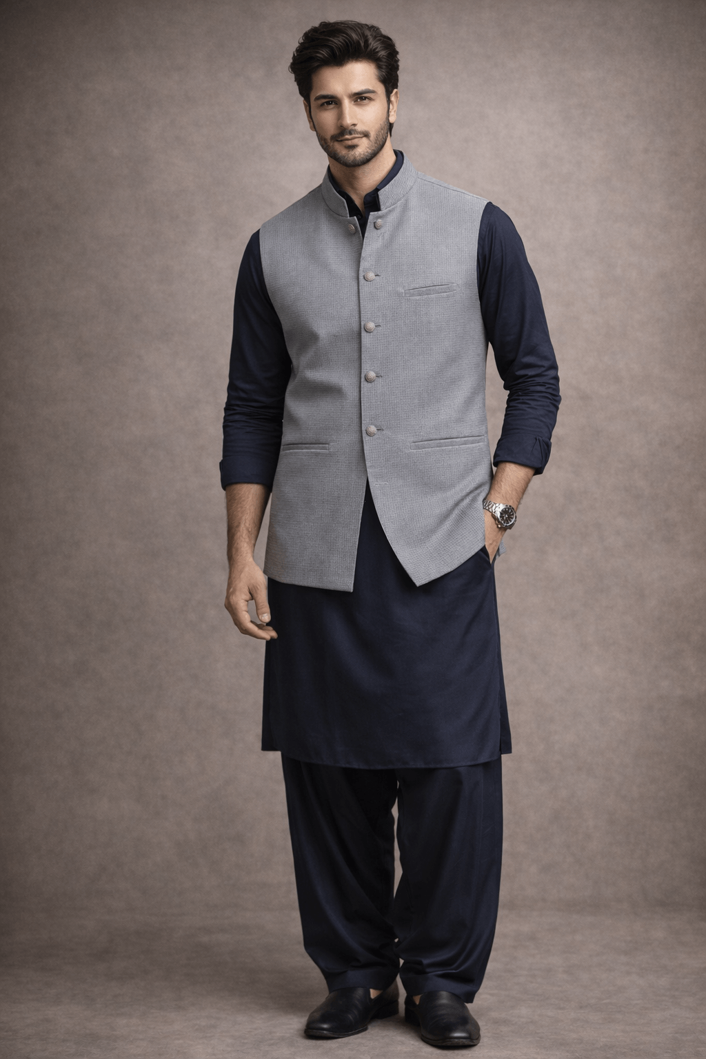 Elevate your style with the J. GREY BLENDED WAISTCOAT, a perfect addition to your traditional outfit that exudes class and sophistication. Crafted with a blend of quality fabrics, this Mens Waistcoat Pakistani guarantees an unparalleled fit.