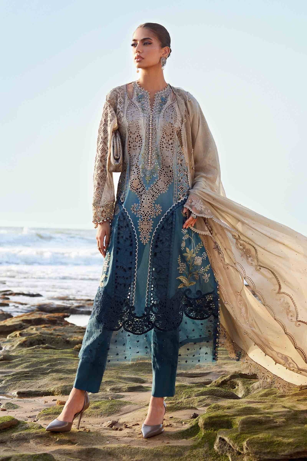 Crafted with meticulous attention to detail, the ensemble features a stunning lawn shirt. The women's 3 piece suit front is adorned with delicate 3D flowers, shimmering pearls, and intricate embroidery that speaks volumes of luxury. The exquisite organza ghera patch and embroidered sleeve jaal redefine grace and opulence.