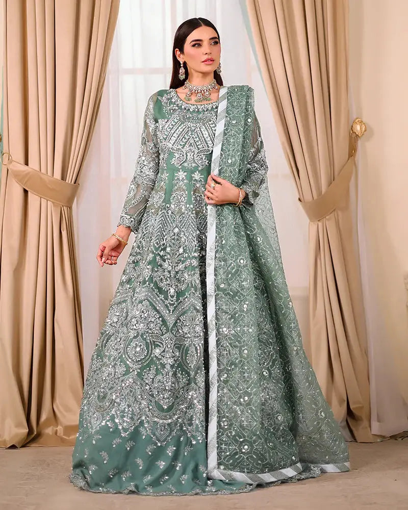 AROOSH Organza Maxi - Pakistani Asian Clothes | Embellished Dress in green with intricate silver embroidery, full sleeves, and matching dupatta.