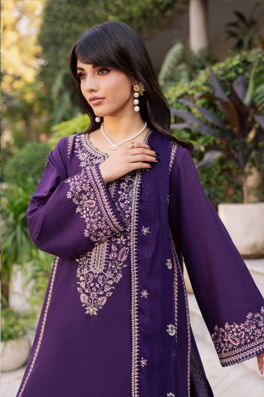 This three-piece khaddar shirt features a long, five-panelled design with intricate embroidery on the panels and neckline. The flared sleeves are adorned with detailed embroidery and finished with delicate cotton lace at the cuffs and hem, reflecting fine craftsmanship and elegance.