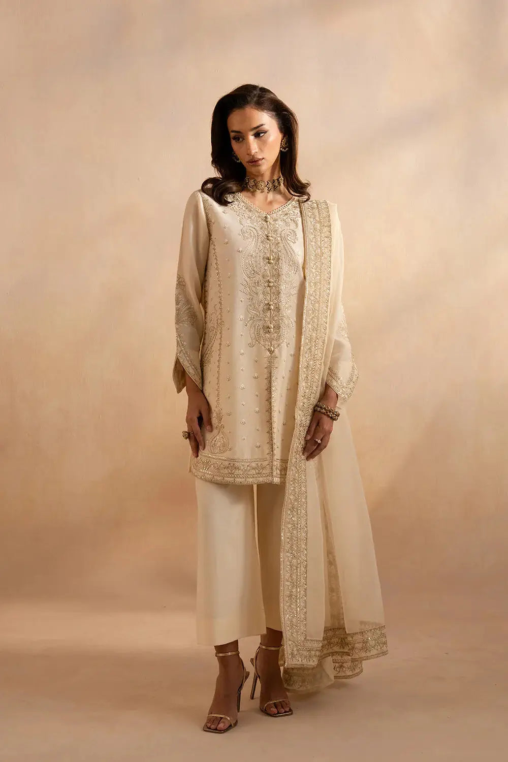 This set includes a beautifully embroidered organza silk shirt, a straight plain-dyed trouser for a sleek fit, and a matching organza dupatta bordered on all four sides with intricate embroidery. The BEIGE color palette enhances the delicate embroidery, making it a versatile choice for any occasion.