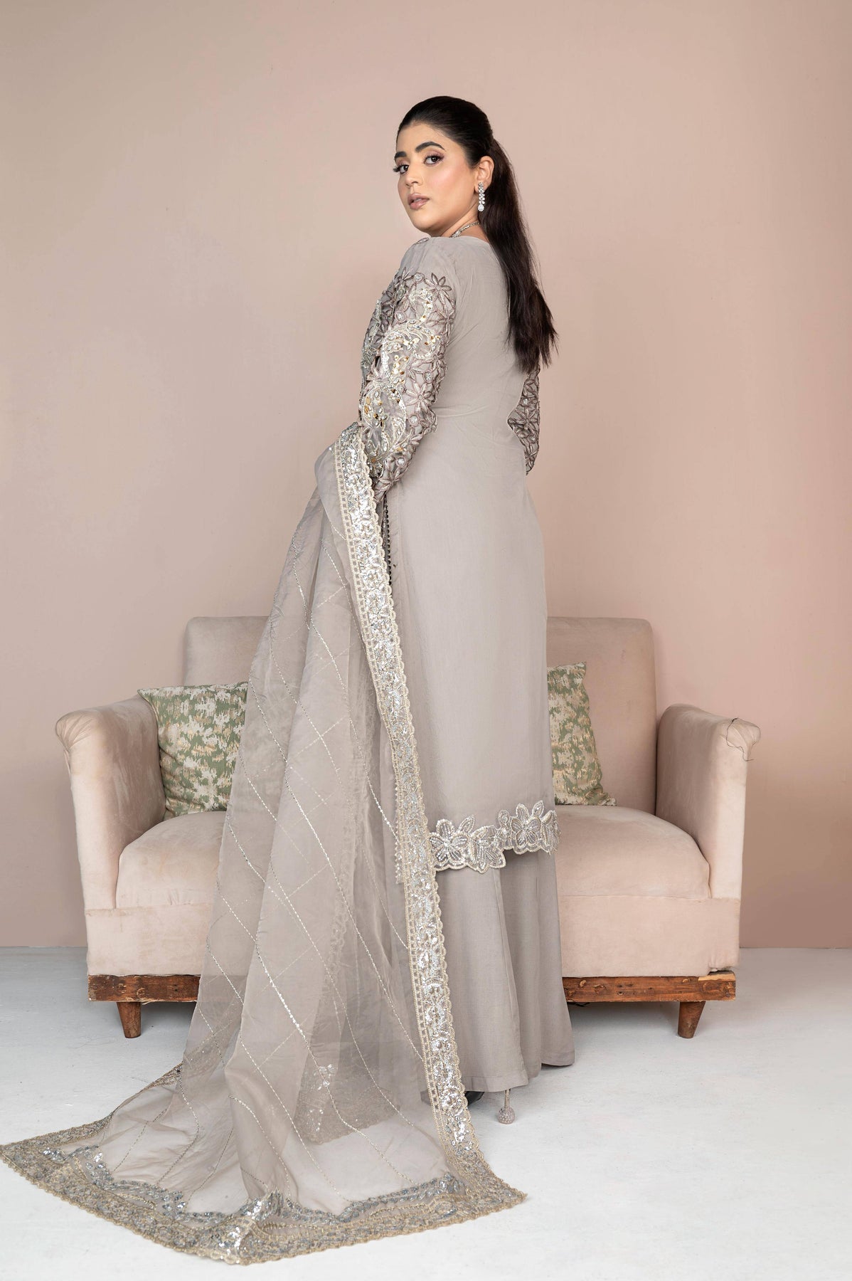Back view of RANGREZA SAJNI RS-3528-1300 showcasing plain grey back and detailed embroidered dupatta. Elegant Pakistani designer outfit.