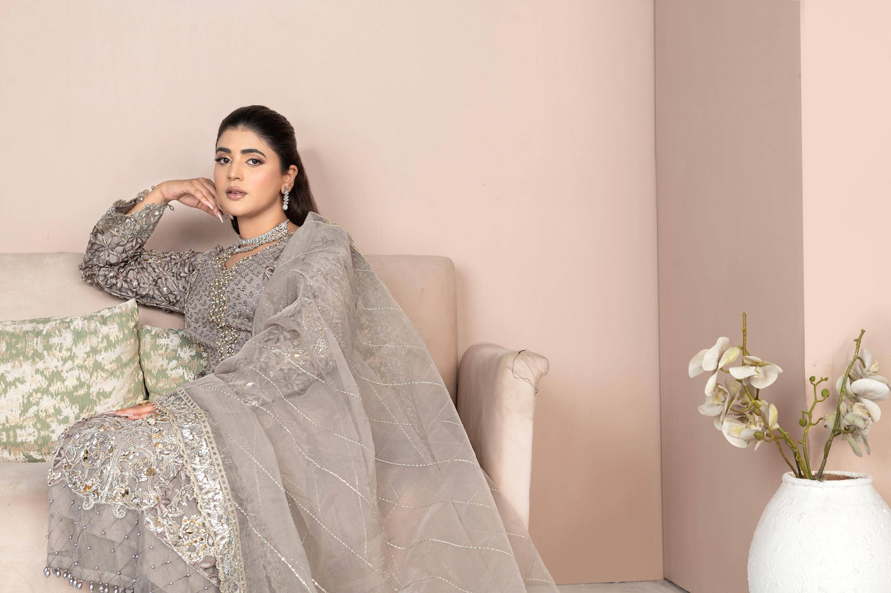 Introducing the RANGREZA SAJNI | RS-3528-1300, a masterpiece of Pakistani designer wear that blends traditional elegance with contemporary style. This stunning ensemble features a sophisticated grey hue, crafted from luxurious organza fabric for the shirt and an intricately embroidered organza dupatta, ensuring you stand out at any event.