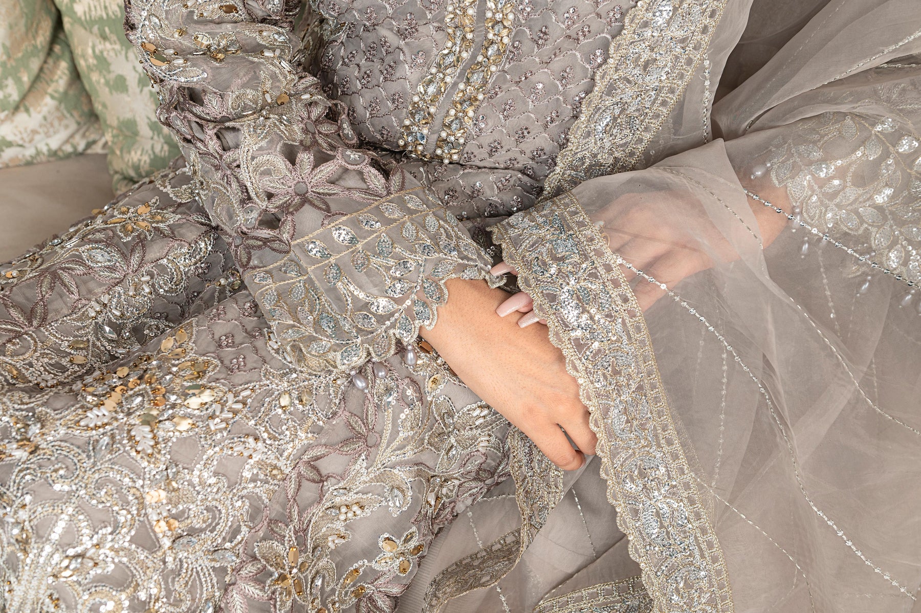 Detailed embroidery on sleeve and dupatta of RANGREZA SAJNI RS-3528-1300 in grey organza. Premium Pakistani designer apparel.