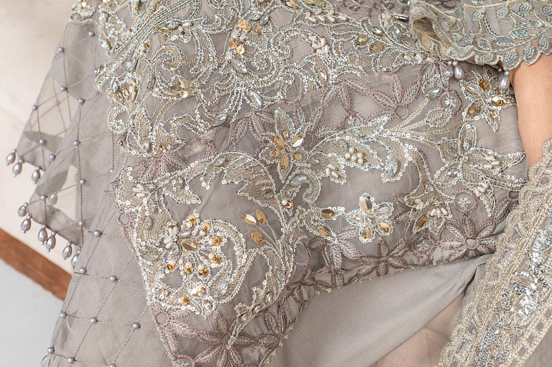 Close-up of RANGREZA SAJNI RS-3528-1300 grey organza shirt with mirror work and embroidery, styled with matching dupatta. Pakistani designer clothing.