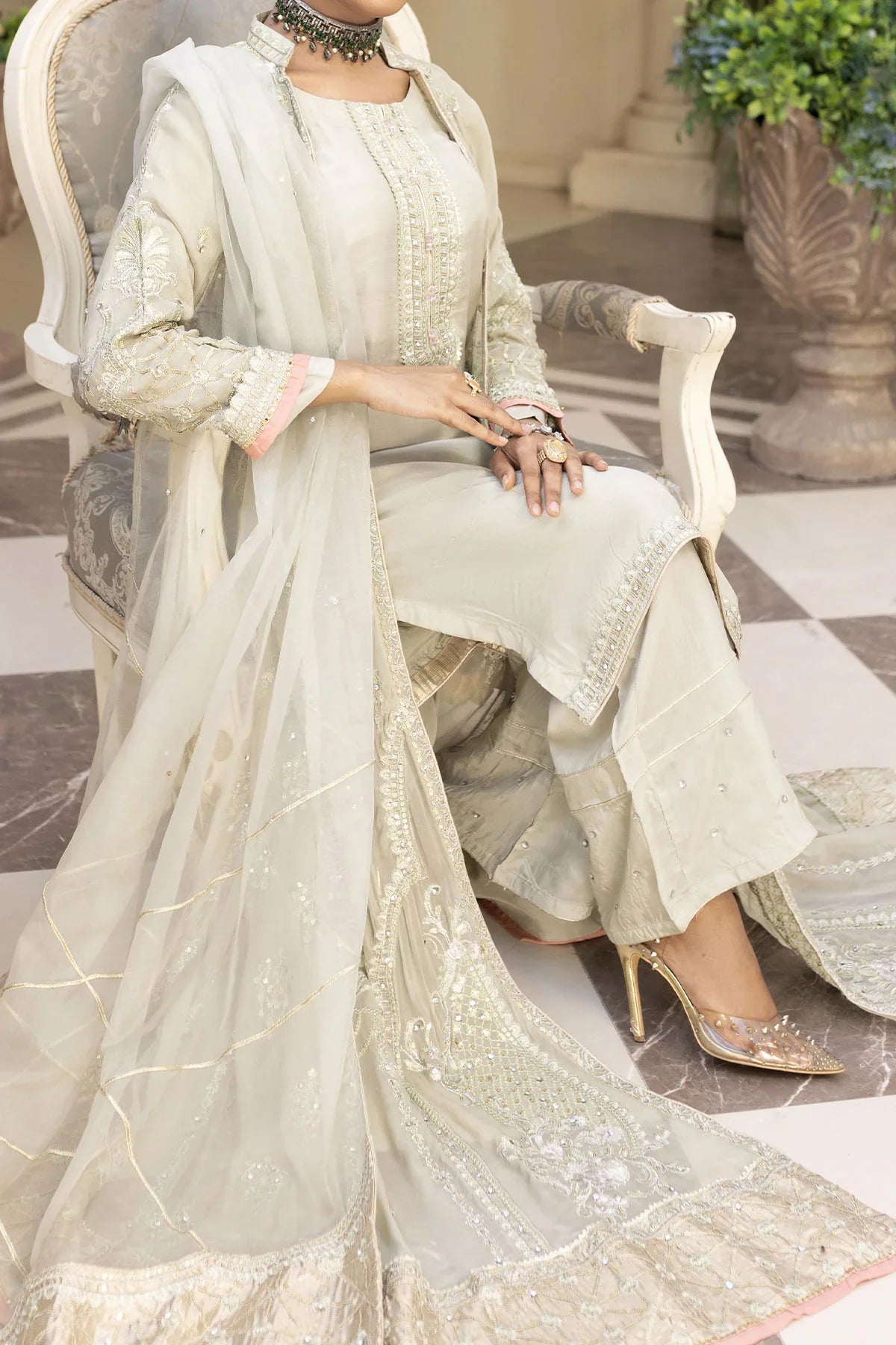 Front view of ivory Pakistan gown dress woman with embroidered shirt pants and dupatta, ideal for elegant events.
