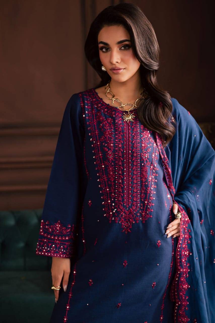 • Elegant Design: Features a deep blue khaddar fabric beautifully finished with intricate embroidery.