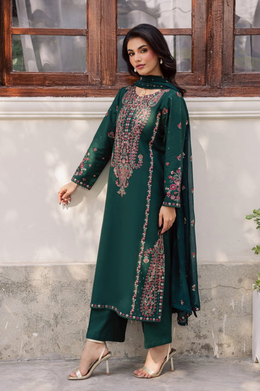 Embrace elegance and comfort with the BATIK Rain 3Pc - Embroidered Khaddar Dress. This stunning emerald green khaddar outfit is designed to make a statement while providing utmost comfort for any occasion.