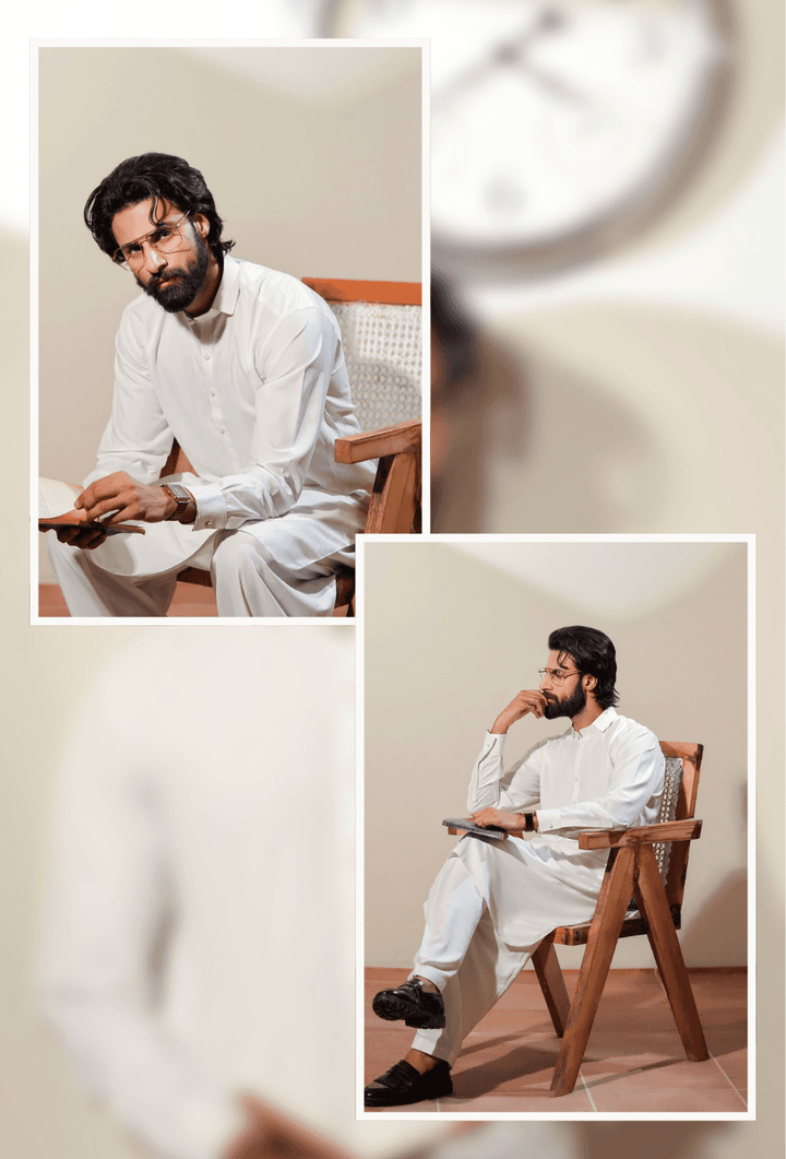 Men's white collar kameez shalwar MA-88 styled in a seated pose, highlighting its versatile and graceful traditional appeal.