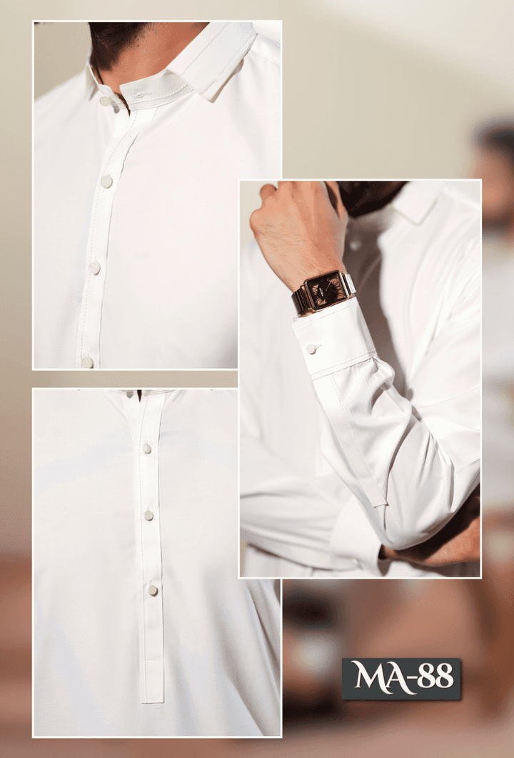 White Collar Kameez Shalwar MA-88 for men, featuring a modern fit and elegant design, ideal for both casual and formal wear.